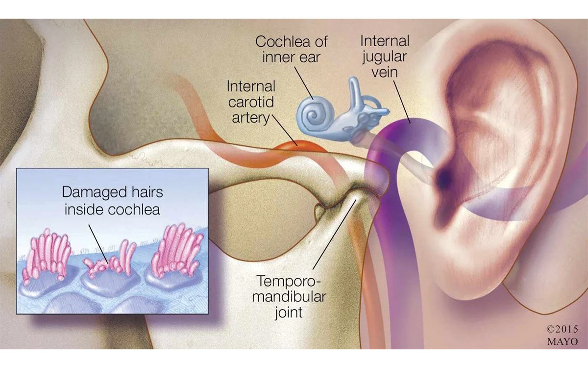 Noise-induced hearing loss:NIHL is often caused by prolonged, continuous noise exposure. The level of inner ear damage is determined by the intensity of the sound, the time of exposure, and hereditary predisposition. Tinnitus is typically bilateral, continuous, and high in pitch.